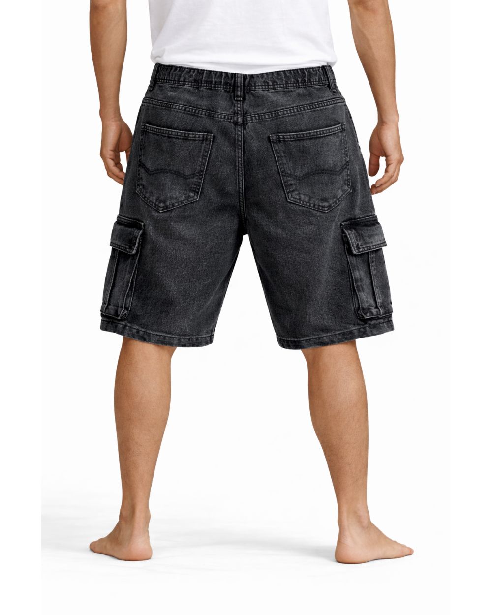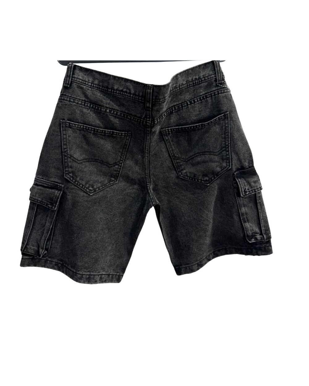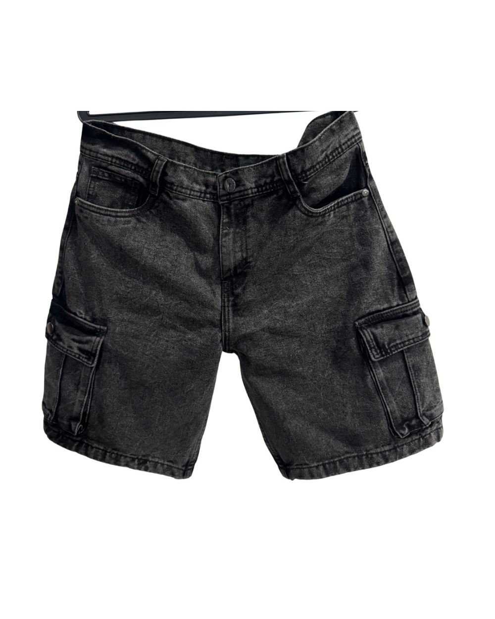 Crafted from premium black-wash denim, they feature spacious side cargo pockets along with classic back pockets for added convenience. The relaxed above-the-knee length ensures comfort and easy movement, while the washed finish gives them a bold, street-inspired look.