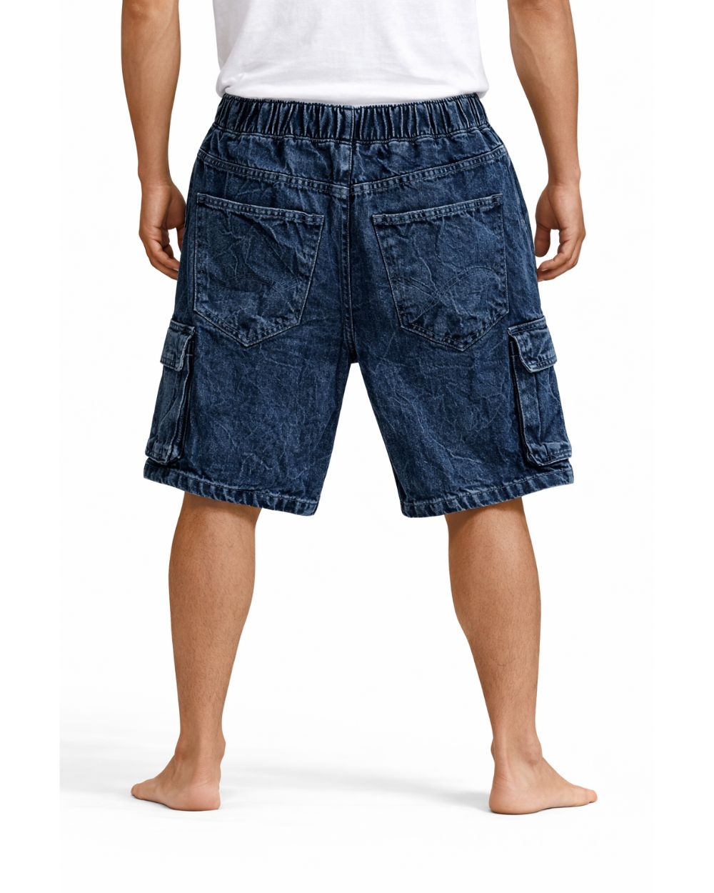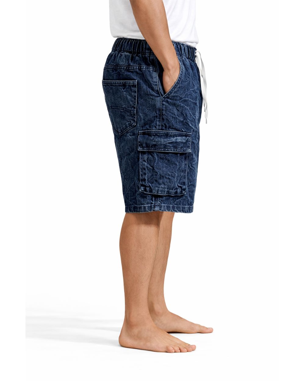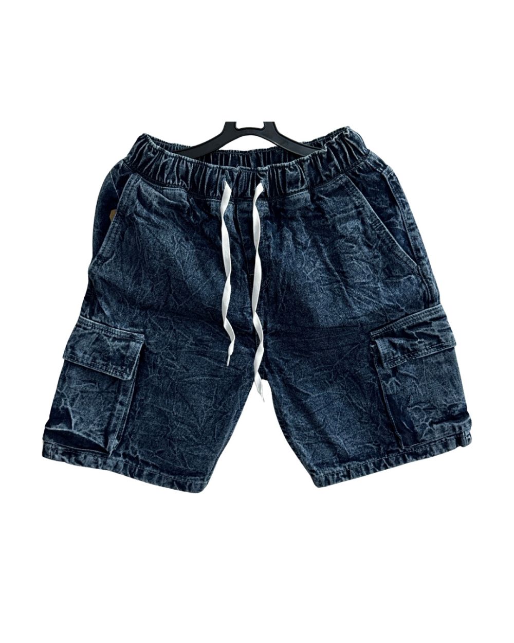Comfortable blue wash denim cargo shorts featuring an elastic waistband with adjustable drawstring and functional side cargo pockets. Perfect for casual summer styling.