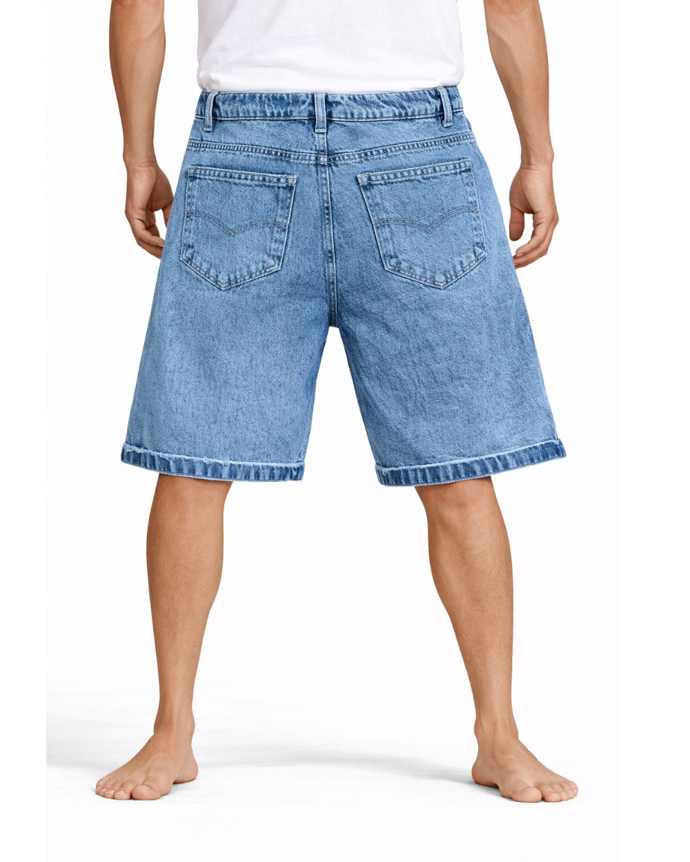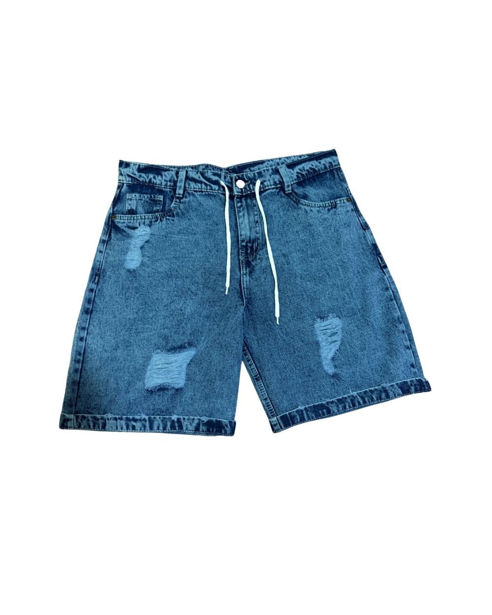 Crafted from durable blue-wash denim, they include an elastic waistband with adjustable drawstring for a flexible and secure fit. The above-the-knee length and relaxed silhouette ensure comfort and ease of movement throughout the day.